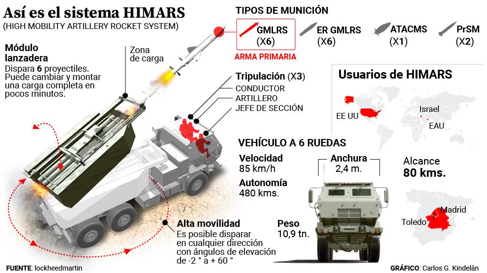 Sin ayuda de otros vehículos, un pequeño grupo de personas puede cambiar una carga de misiles disparada y montar otra en cuestión de minutos. Los misiles guiados por GPS que dispara tienen un alcance que casi duplica el de los obuses M777, entregados también a Ucrania.