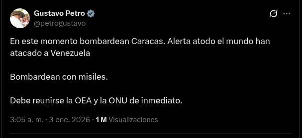 "En este momento bombardean Caracas. Alerta a todo el mundo han atacado a Venezuela. Bombardean con misiles. Debe reunirse la OEA y la ONU de inmediato", escribió el mandatario en la red social X