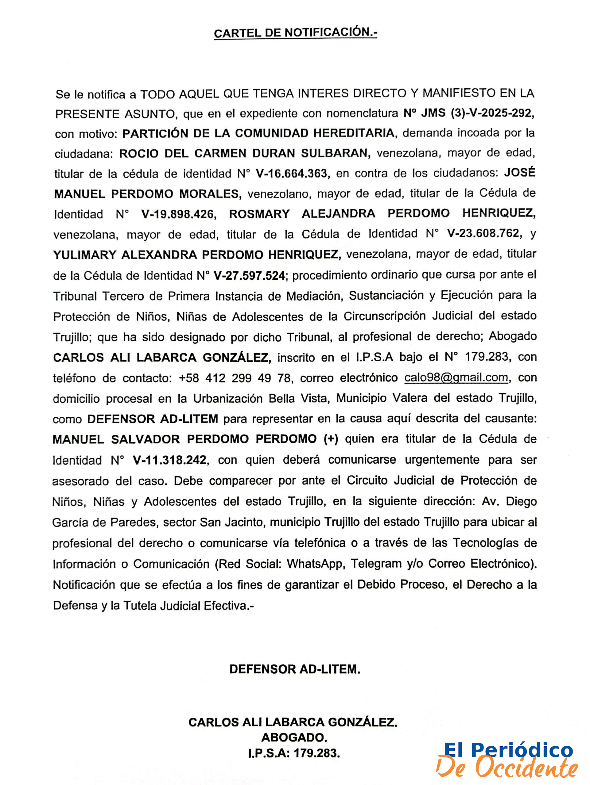 CARTEL DE NOTIFICACIÓN. Se le notifica a TODO AQUEL QUE TENGA INTERES DIRECTO Y MANIFIESTO EN LA PRESENTE ASUNTO, con motivo: PARTICIÓN DE LA COMUNIDAD HEREDITARIA, demanda incoada por la ciudadana: ROCIO DEL CARMEN DURAN SULBARAN, venezolana, con cédula de identidad N° V-16.664.363, en contra de los ciudadanos: JOSÉ MANUEL PERDOMO MORALES, con Cédula de Identidad N° V-19.898.426, ROSMARY ALEJANDRA PERDOMO HENRIQUEZ, con Cédula de Identidad N° V-23.608.762, y YULIMARY ALEXANDRA PERDOMO HENRIQUEZ, con Cédula de Identidad N° V-27.597.524