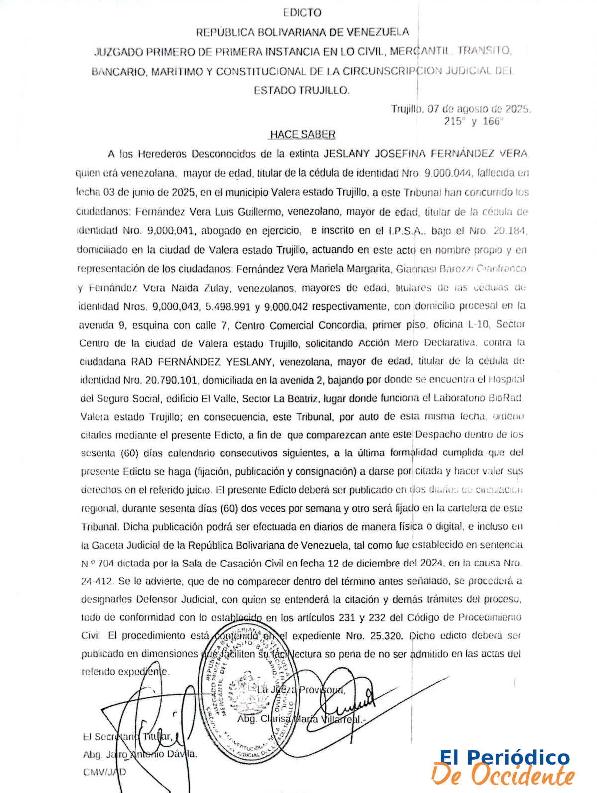Edicto. Se hace saber a los Herederos Desconocidos de la extinta JESLANY JOSEFINA FERNÁNDEZ VERA, quien era titular de la cédula de identidad Nro. 9.000.044 (19-11-2025) 19 noviembre, 2025 - 7:06 a. m.