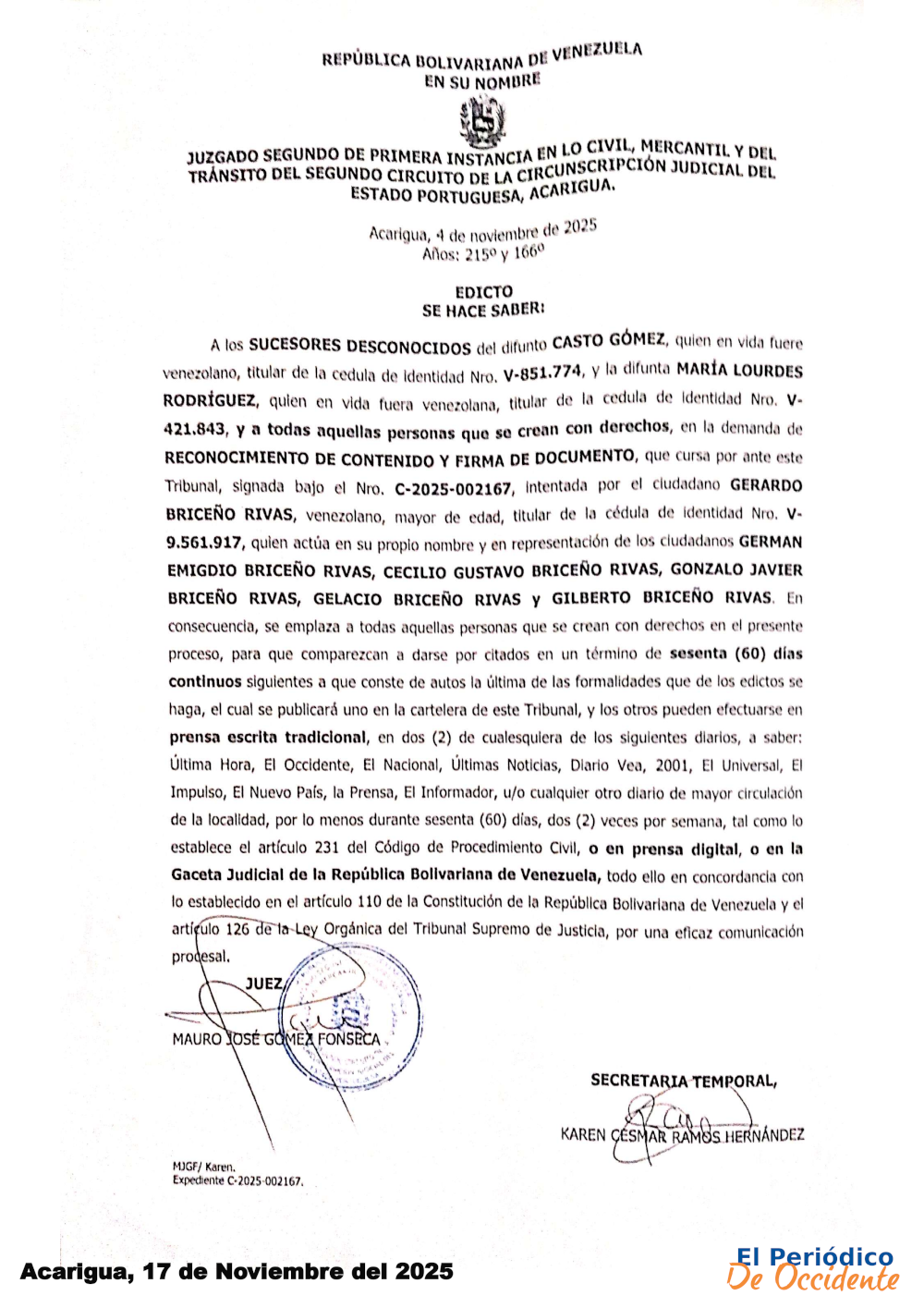 EDICTO. Se hace saber: A los SUCESORES DESCONOCIDOS del difunto CASTO GÓMEZ, quien en vida fuere venezolano, titular de la cédula de identidad Nro. V-851.774, y la difunta MARÍA LOURDES RODRÍGUEZ, quien en vida fuera venezolana, titular de la cédula de identidad Nro. V-421.843, y a todas aquellas personas que se crean con derechos, en la demanda de RECONOCIMIENTO DE CONTENIDO Y FIRMA DE DOCUMENTO