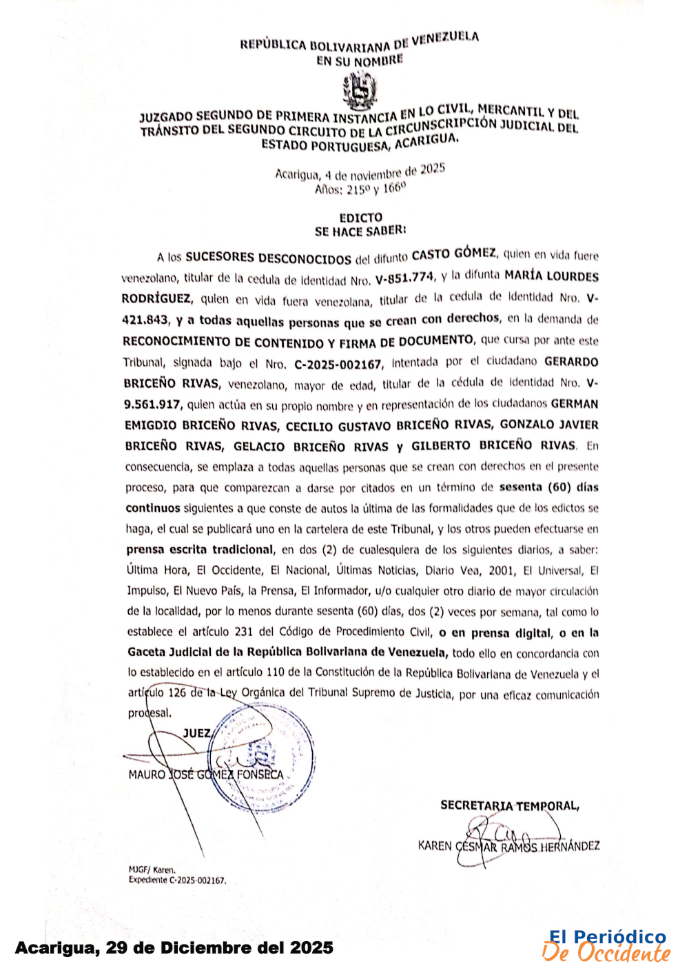 EDICTO. Se hace saber: A los SUCESORES DESCONOCIDOS del difunto CASTO GÓMEZ, quien en vida fuere venezolano, titular de la cédula de identidad Nro. V-851.774, y la difunta MARÍA LOURDES RODRÍGUEZ, quien en vida fuera venezolana, titular de la cédula de identidad Nro. V-421.843, y a todas aquellas personas que se crean con derechos, en la demanda de RECONOCIMIENTO DE CONTENIDO Y FIRMA DE DOCUMENTO 29/12/2025