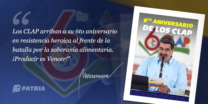 Los beneficiarios recibirán la siguiente notificación por mensaje de texto desde el número 3532: «Los CLAP arriban a su 6to aniversario en resistencia heroica al frente de la batalla por la soberanía alimentaria. ¡Producir es Vencer!».