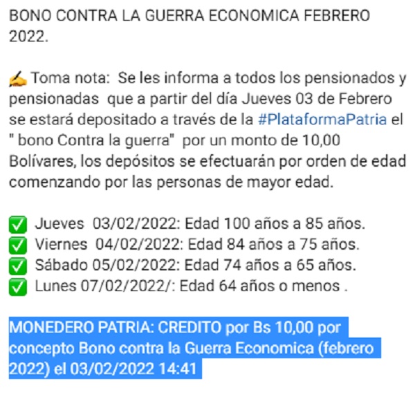 Este jueves arrancó el pago del bono «Contra la Guerra Económica», correspondiente al mes de febrero de 2022, para todos los pensionados del país.