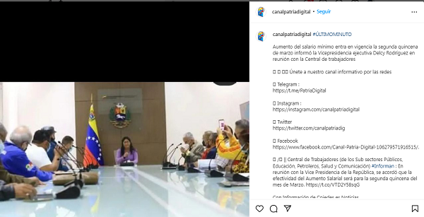 Así lo informaron a través de la cuenta canal patria digital en Instagram este miércoles. «Central de Trabajadores (de los Sub sectores Públicos, Educación, Petroleros, Salud y Comunicación) #Informan : En reunión con la Vice Presidencia de la República, se acordó que la efectividad del Aumento Salarial será para la segunda quincena del mes de Marzo»