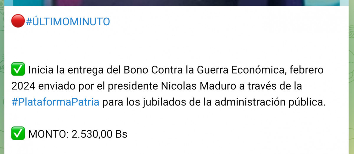 El pasado lunes 19 de febrero, por medio de la cuenta oficial de Telegram del Canal Patria Digital, se anunció el pago del Bono de Guerra Económica correspondiente a los jubilados de la administración pública.