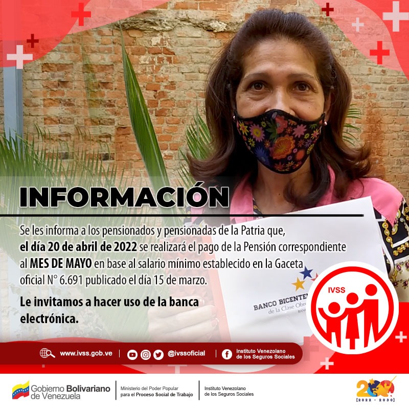 El gobierno de Nicolás Maduro ha anunciado de manera oficial cuándo será cancelado el pago de la pensión correspondiente al mes de mayo; sin embargo, de acuerdo con el pago de los últimos tres meses, la pensión se comienza a cancelar a partir de los 17 de cada mes, es por ello que se prevé que el pago sea realizado el 20 de abril.