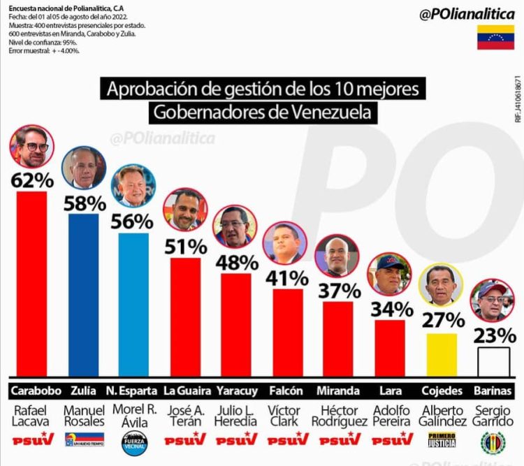 Según el nuevo estudio de opinión pública elaborado por la consultora Polianalítica C.A realizado durante la primera semana del corriente mes de agosto, Rafael Lacava (PSUV) y Manuel Rosales (UNT) son los gobernadores con mejor aprobación durante su actual gestión.