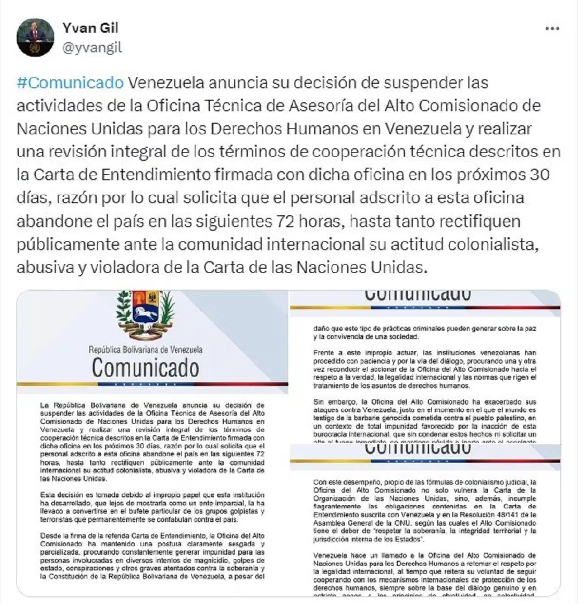 El canciller venezolano, Yván Gil, anunció la decisión del presidente Nicolás Maduro de suspender la Oficina Técnica de Asesoría del Alto Comisionado de Naciones Unidas para los Derechos Humanos (OACNUDH) en Venezuela.
