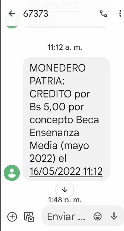 Asimismo, el día de ayer se comenzó a pagar el estipendio «Beca Enseñanza Media», para estudiantes de educación media, por un monto de 5 bolívares, equivalente a 1 dólar aproximadamente.