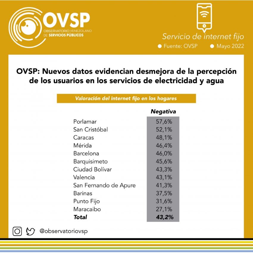 En cuanto a la valoración de la calidad del servicio de internet fijo, el 53,8% evaluó positivamente su desempeño contra un 43,2% de usuarios que opinó desfavorablemente. Por su parte, Maracaibo con 75,0% y Punto Fijo con 65,0% fueron las urbes con las mejores evaluaciones de calidad, mientras que las menores proporciones de valoración positiva se observaron en San Cristóbal (46,2%) y Porlamar (40,6%), según el OVSP.