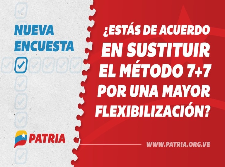 El Gobierno Nacional, a través del Sistema Patria, somete a consulta del pueblo la posible sustitución del método 7+7 por mayor flexibilización, idea que estaba siendo analizada por el Presidente Nicolás Maduro Moros, tal como lo anunció el pasado 14 de julio en una transmisión pública.