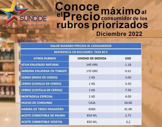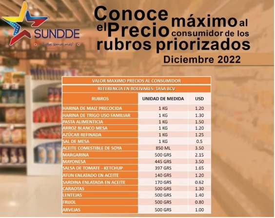 La Superintendencia Nacional para la Defensa de los Derechos Socioeconómicos (Sundde) eliminó este viernes, 2 de diciembre, la lista de precios máximos al consumidor de los rubros priorizados publicada el día anterior, el jueves 1 de diciembre.