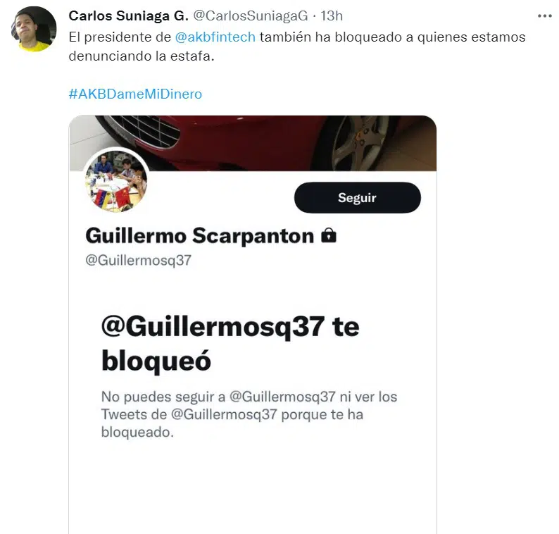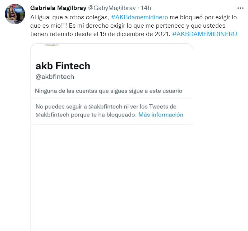 Los usuarios que mostraron su descontento con la etiqueta #AKBDameMiDinero en Twitter, ya habían advertido que la empresa puso privada su cuenta en esa red social, pero también que varios de los denunciantes fueron bloqueados.