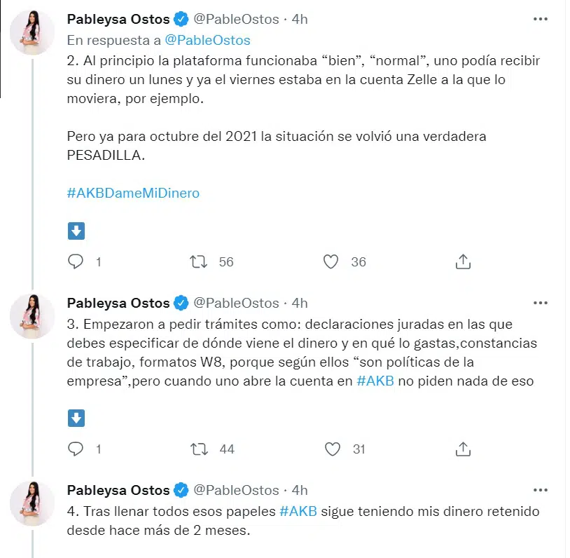 La periodista Lorena Bornacelly también compartió su experiencia con AKB en redes sociales. Confesó que presentó problemas de salud asociados al covid-19 durante varios meses y no pudo disponer de su dinero para los gastos porque estaban retenidos en la aplicación.