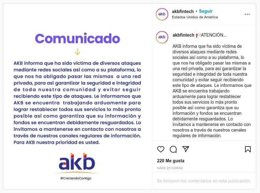 La empresa AKB publicó el sábado 5 de febrero un comunicado en el que se refirió a supuestos ataques a la plataforma y en redes sociales. La compañía señaló que por ese motivo privatizaron sus perfiles en Twitter e Instagram.