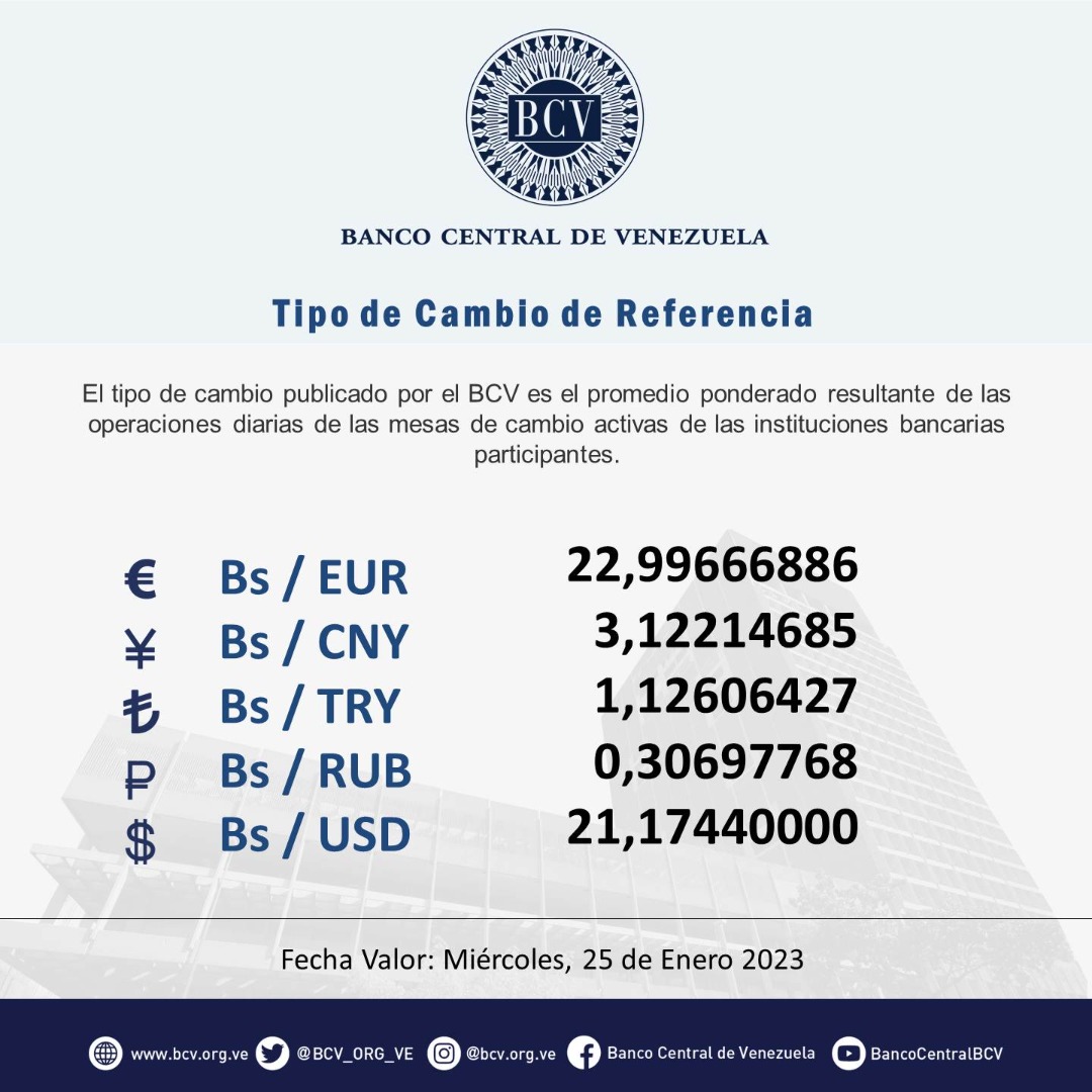 El tipo de cambio publicado por el BCV es el promedio ponderado de las operaciones de las mesas de cambio de las instituciones bancarias. Al cierre de la jornada del día martes 24-01-2023, los resultados son: